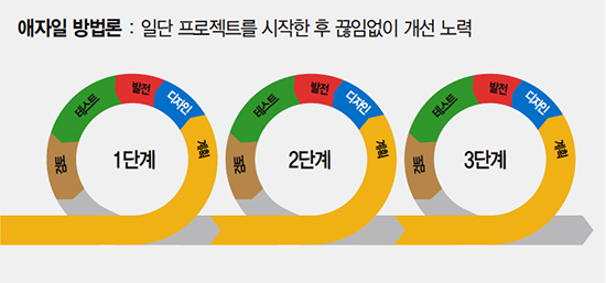 계획을 세운 후 다음 단계까지 기다려서 절차대로 진행하는 폭포수 모델과 달리 먼저 진행 후 분석, 시험, 피드백을 통하여 개선하여 나가는 진행 모델이다.