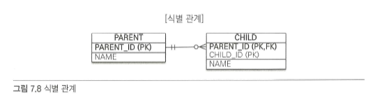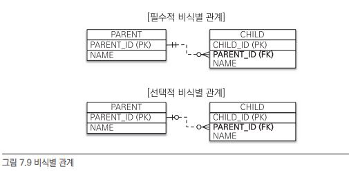데이터베이스 테이블 사이에 관계는 외래 키가 기본 키에 포함되는지 여부에 따라 식별 관계와 비식별 관계로 구분한다. 최근에는 비식별 관계를 주로 사용하고 꼭 필요한 곳에만 식별 관계를 사용하는 추세다.