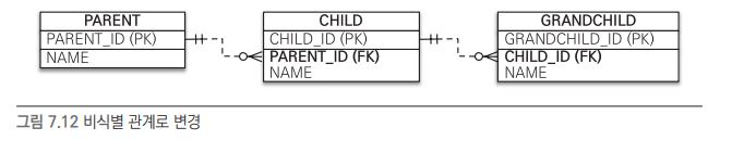 - 식별 관계는 부모 테이블의 기본 키를 자식 테이블로 전파하기 때문에 기본 키 컬럼이 점점 늘어나게 된다.(자식 테이블) 결국 조인할 때 SQL이 복잡해지고 기본 키 인덱스가 불필요하게 커질 수 있다.