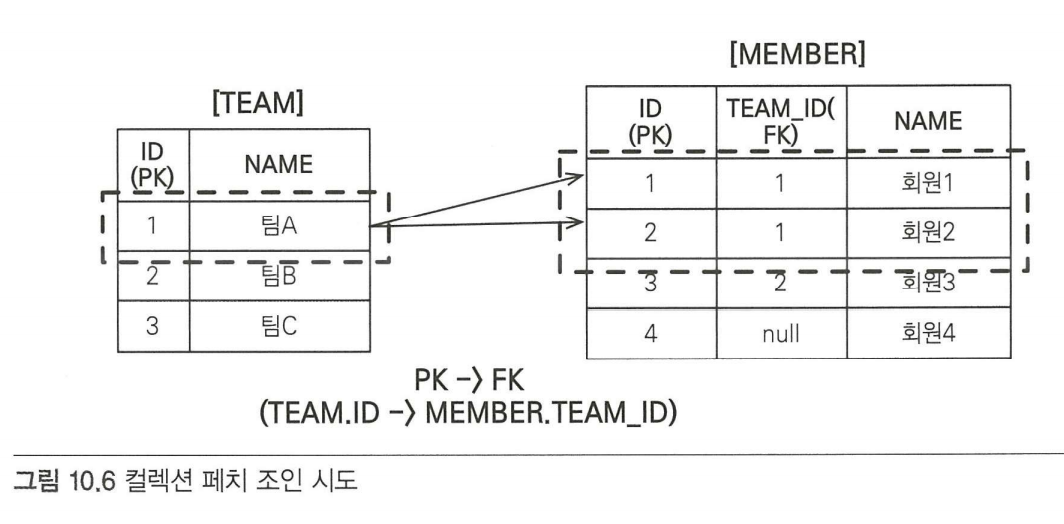 팀과 회원 컬렉션을 조인했으므로 회원 컬렉션도 함게 조회할 것으로 기대하지만 실제는 회원 컬렉션은 전혀 조회되지 않는다.