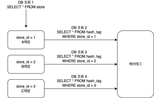 매장 목록 조회 시 매장에 등록된 해쉬태그를 가져오기 위해 일대다 관계를 맺고 있는데 이것 때문에 데이터당 한번씩 더 조회가 되고 있었다.