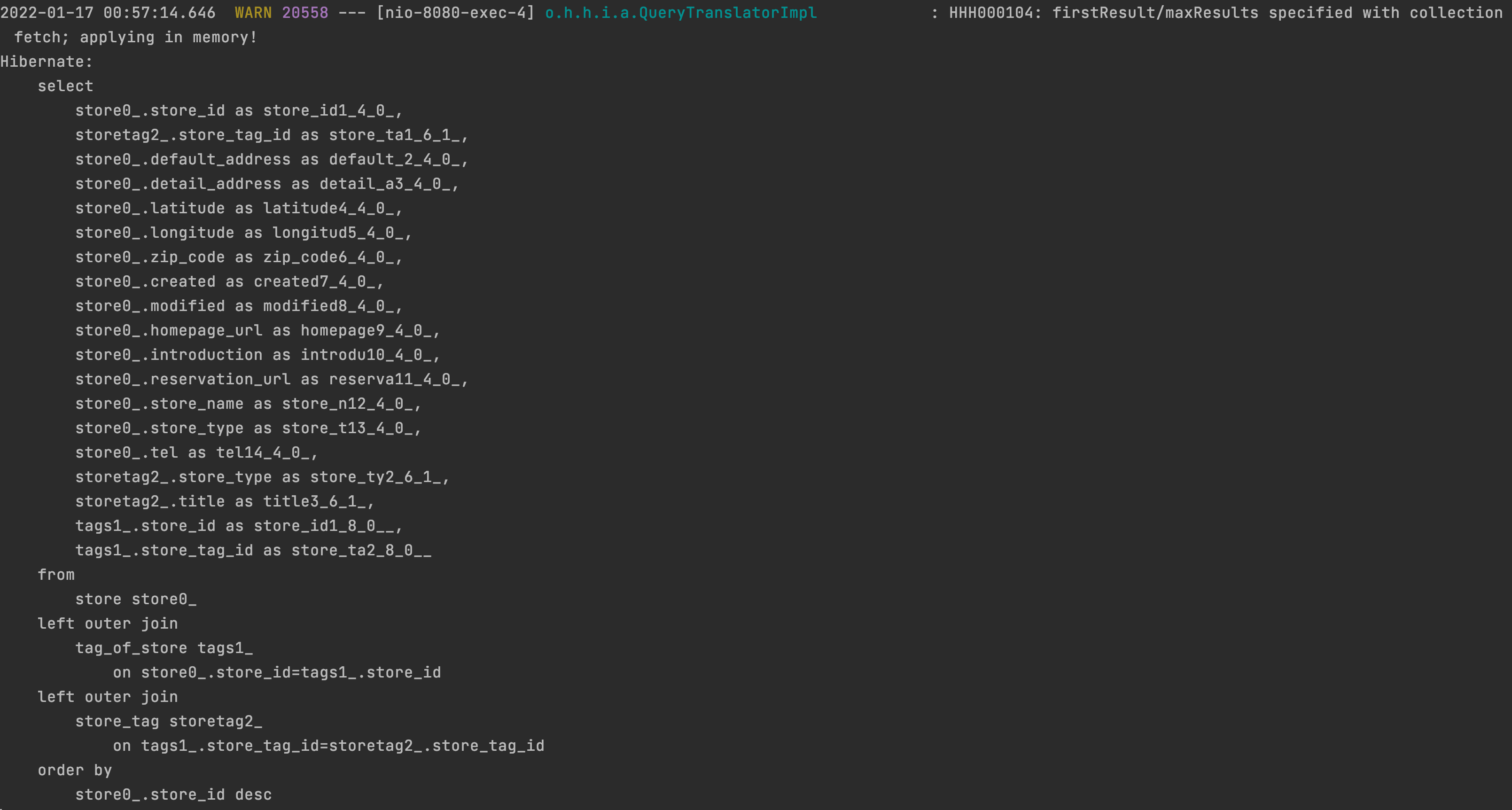 그래서 구글링 해보니 결과물을 모두 가져온 후 애플리케이션 메모리에서 직접 골라내기 때문에 데이터 수가 많다면 OutOfMemory(OOM) 이슈가 발생한다고 한다.. 그리고 조회된 데이터의 갯수가 매장 데이터가 수가 아닌 해시태그 수로 나오기 때문에 fetchJoin과 Pageable은 함께 사용할 수 없다는 것이다..