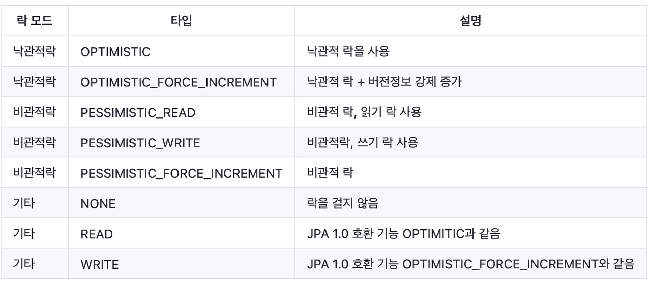 @Version만 적용했을 때는 엔티티를 수정해야 버전을 체크하지만 이 옵션을 추가하면 엔티티를 조회만 해도 버전을 체크한다. 쉽게 이야기해서 한 번 조회한 엔티티는 트랜잭션을 종료할 때까지 다른 트랜잭션에서 변경하지 않음을 보장한다.