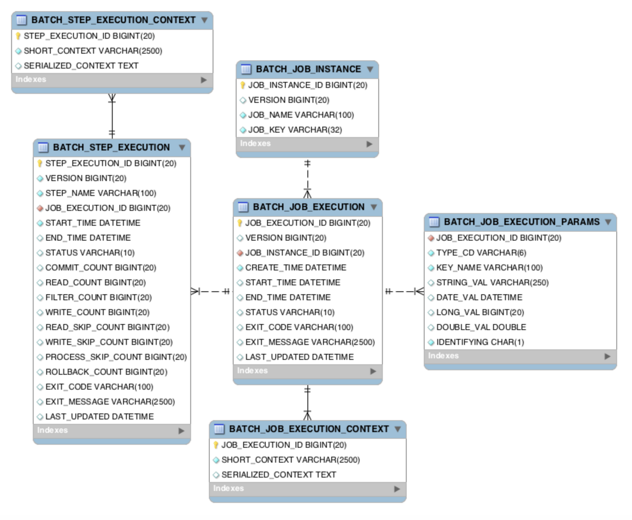 기본적으로 H2 DB를 사용할 경우엔 Boot가 실행될 때 자동으로 생성해주지만, MySQL이나 Oracle과 같은 DB를 사용할 때는 자동으로 생성되지 않는다. 나는 MySQL을 사용하였기 때문에 배치가 실패한 것이다.