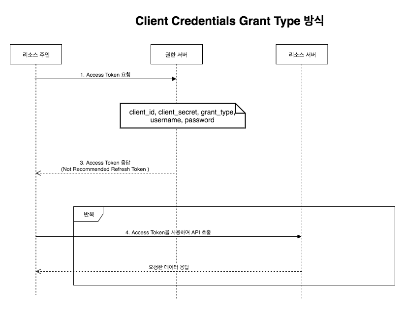클라이언트 자격 증명 타입클라이언트가 컨텍스트 외부에서 액세스 토큰을 얻어 특정 리소스에 접근을 요청할 때 사용하는 방식입니다.