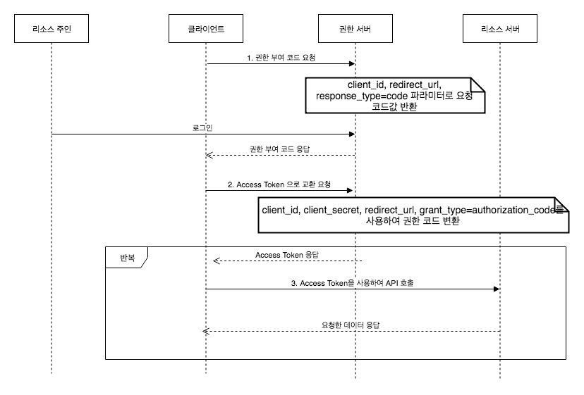 - 이때 필요한 파라미터는 클라이언트 ID, 클라이언트 비밀번호, 리다이렉트 URI, 인증 타입 입니다.