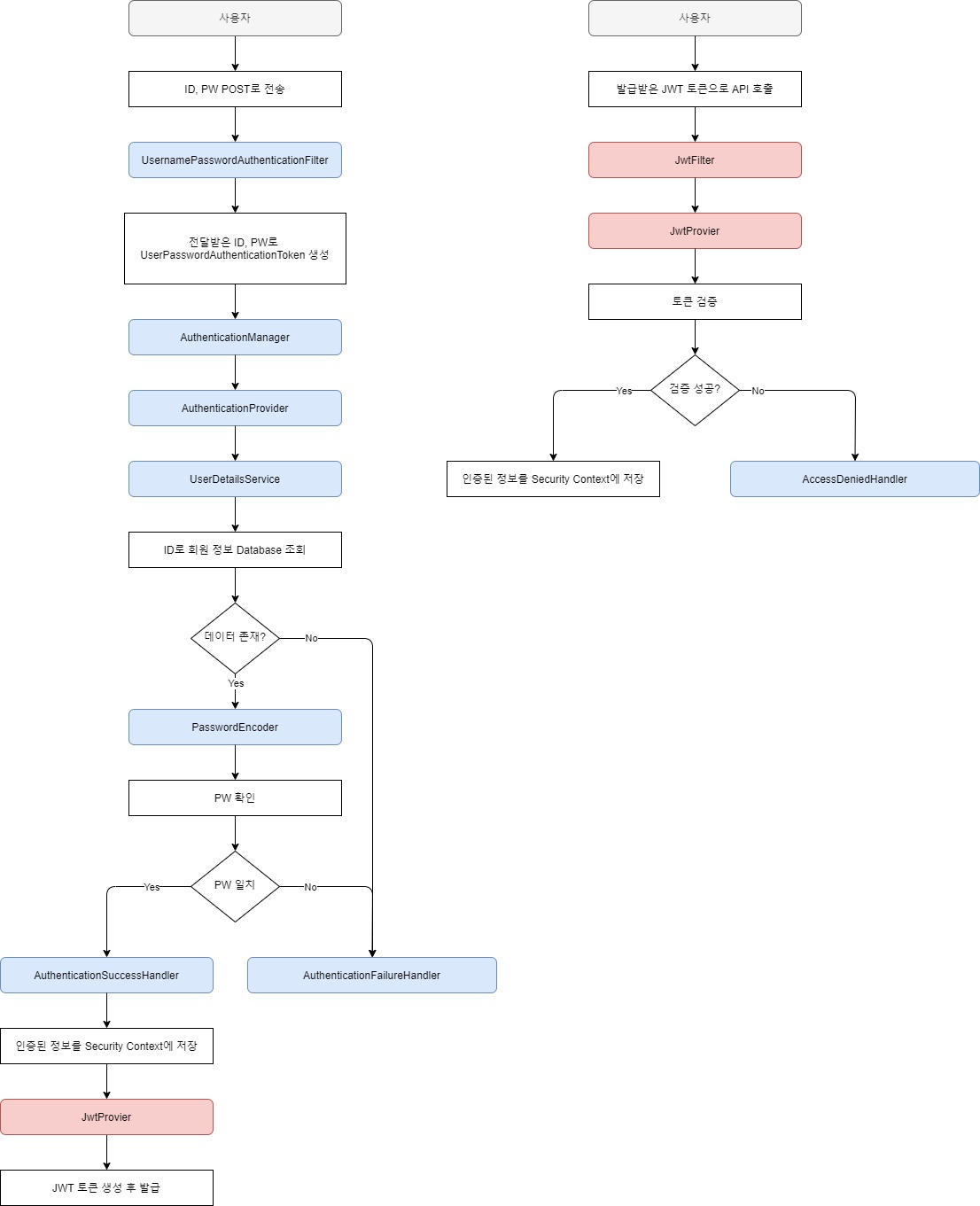 * JWT의 인증 및 권한을 확인하는 필터